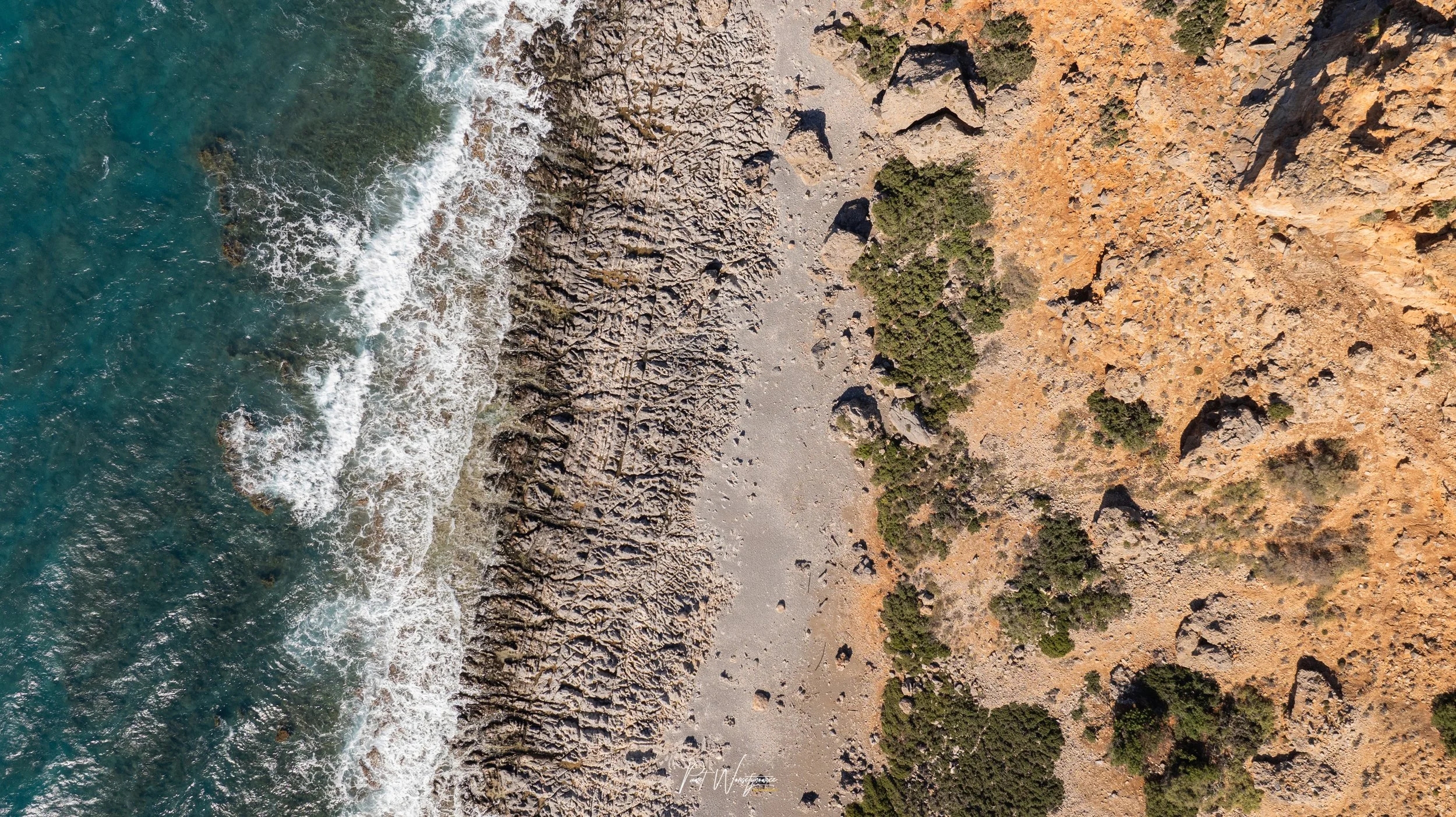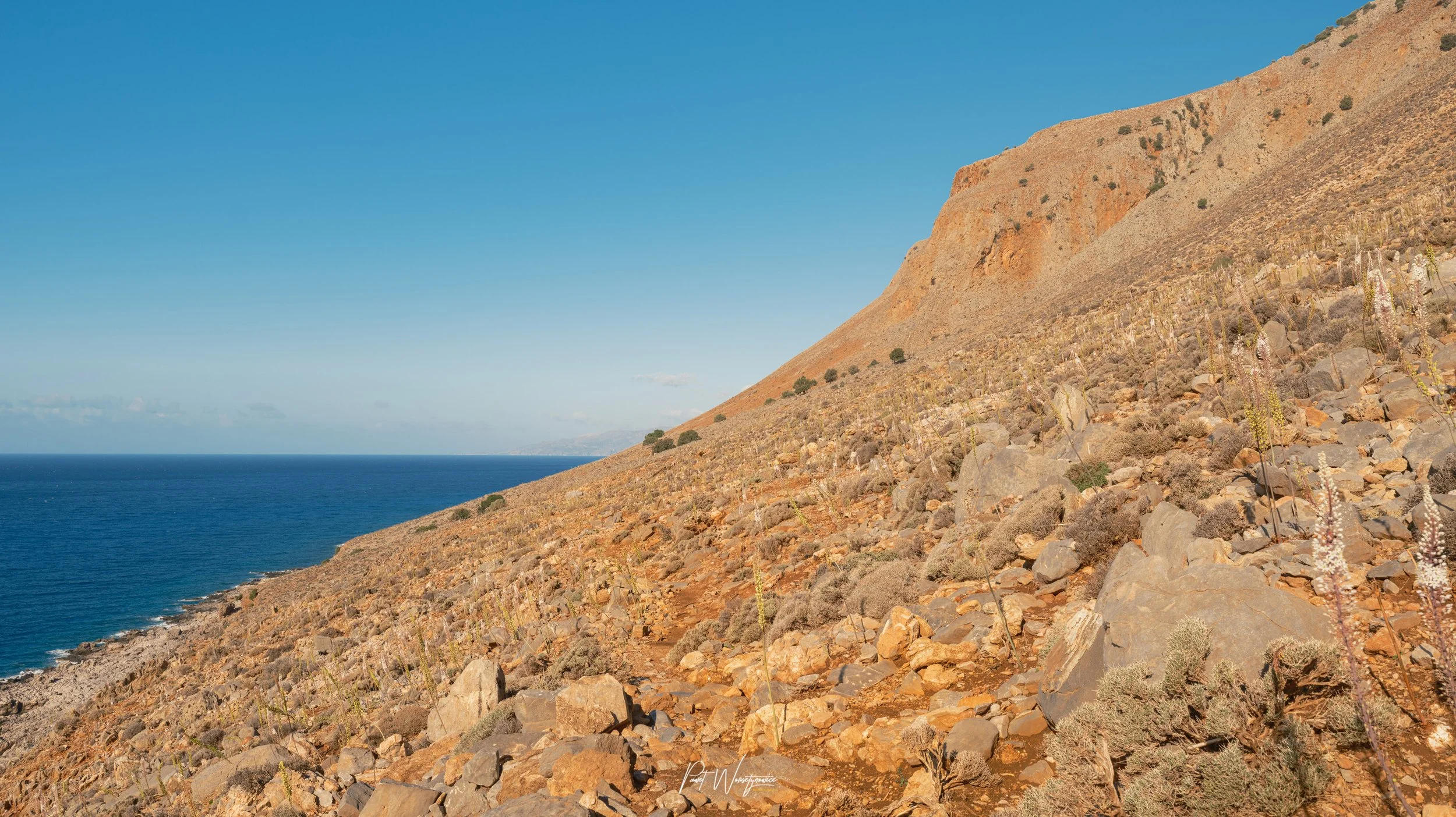 Po wyjściu z okolic Aradeny przez około 3,5 kilometra krajobraz jest dość monotonny – surowe ściany skał piętrzą się po jednej stronie niczym naturalne mury obronne. Ale mniej więcej w okolicach piątego kilometra wszystko się zmienia. Szlak nabiera lekkości, zaczyna się wić wzdłuż zbocza schodzącego wprost do spokojnych tego dnia wód Morza Libijskiego.