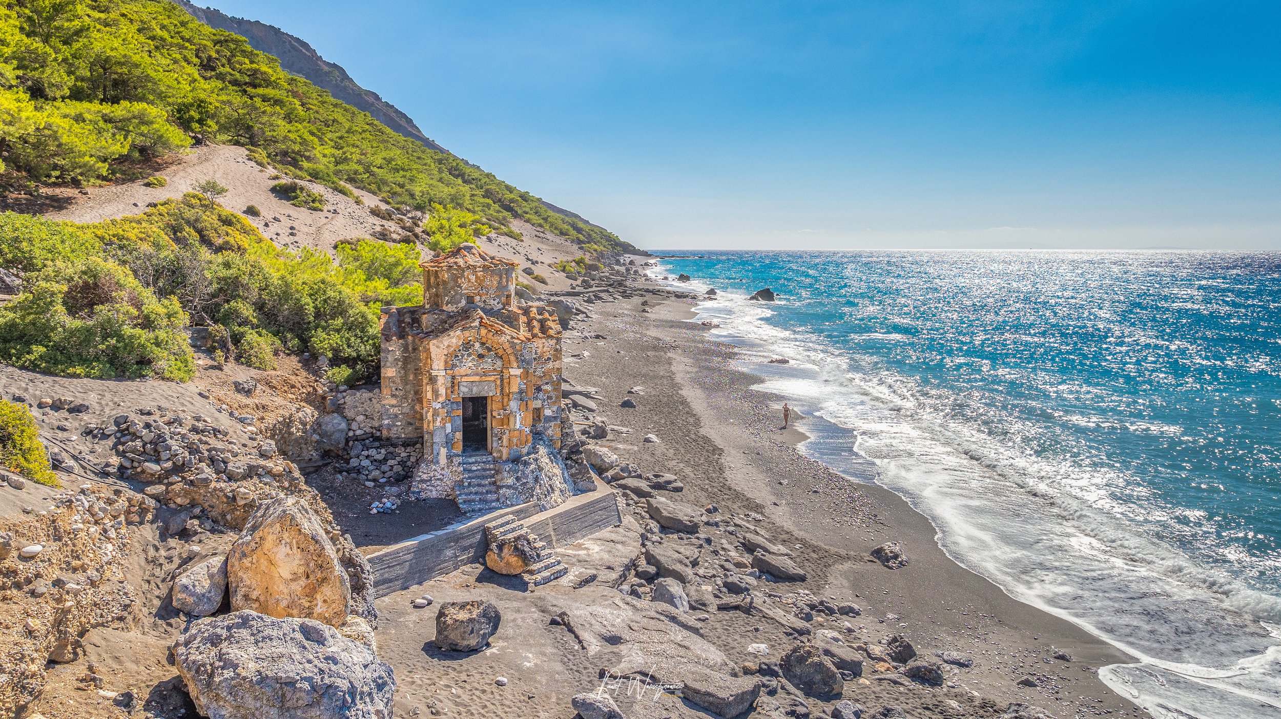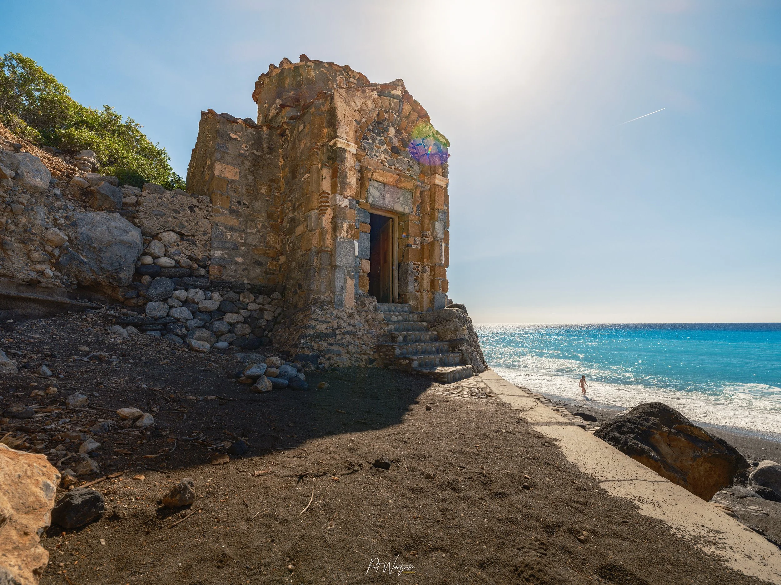 Powoli docieramy do głównej atrakcji tego fragmentu szlaku – zjawiskowej plaży Agios Pavlos. To tutaj stoi niewielka kapliczka Ekklisia Agios Pavlos, pochodząca z X wieku. Jej potężne, wzmocnione fundamenty od lat opierają się falom rozbijającym się o brzeg. Jest otwarta – można wejść do środka i poczuć atmosferę tego miejsca, gdzie czas zdaje się płynąć inaczej.
