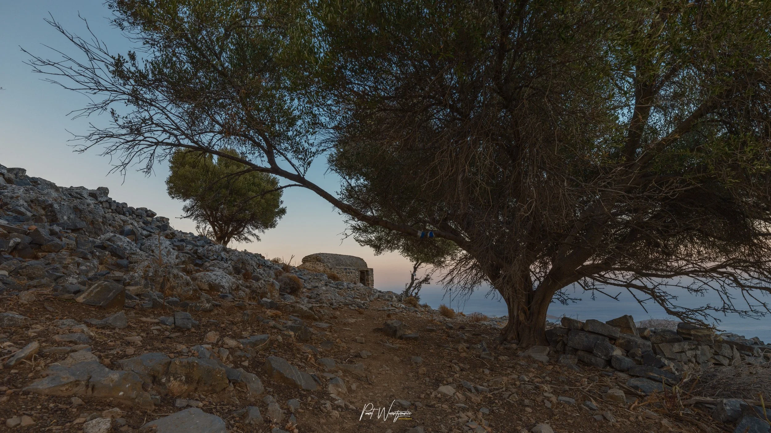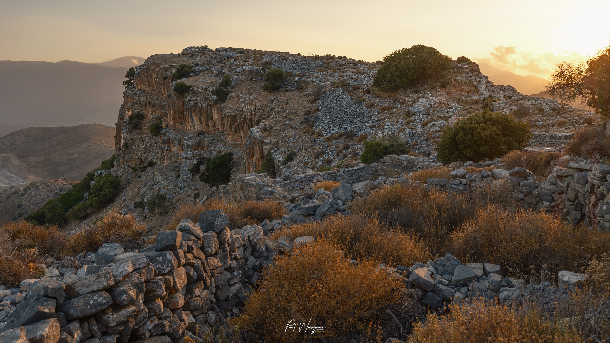 Po około 20 minutach wspinaczki dotarliśmy do pierwszych zabudowań. Ruiny murów obronnych i zabudowań robiły niesamowite wrażenie w ostatnich promieniach słońca. Grzbiet Oxa jest wąski i naturalnie chroniony stromymi zboczami, a szczyt rozdziela się na dwa wierzchołki. Pomiędzy nimi wzniesiono kaplicę Timios Stavros. Choć była zamknięta, sam widok jej białych murów na tle pomarańczowego nieba robił surrealistyczne wrażenie.